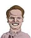 Billettmannen kjem heilt bort til dei. Han har eit finurleg blikk, han ser ikkje eigentleg stressa ut. Han prøvar å formulere ei setning, men vert stoppa av sin eigen latter.